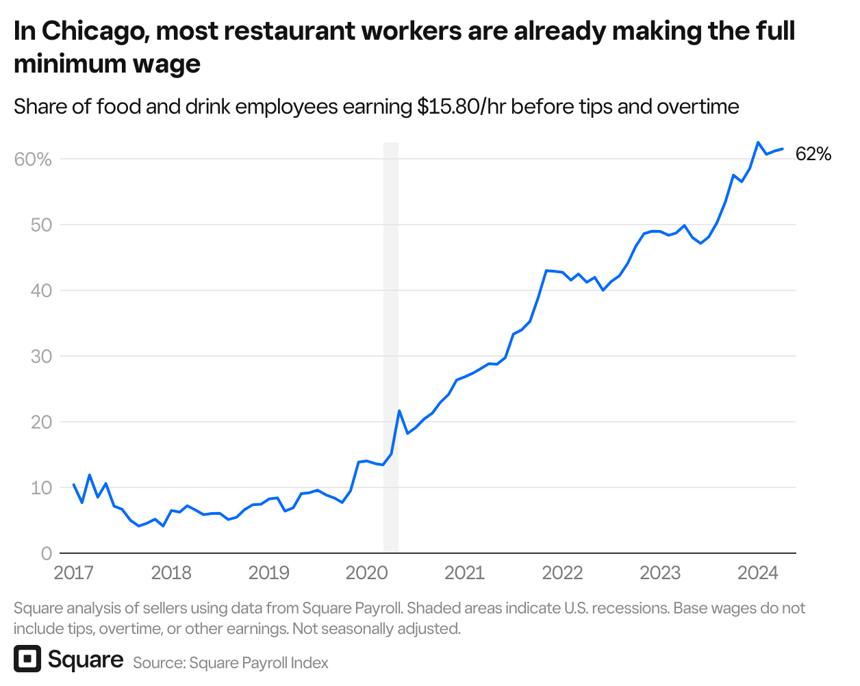As of April 2024, Square found that 62% of restaurant workers in Chicago are